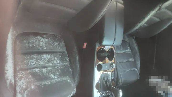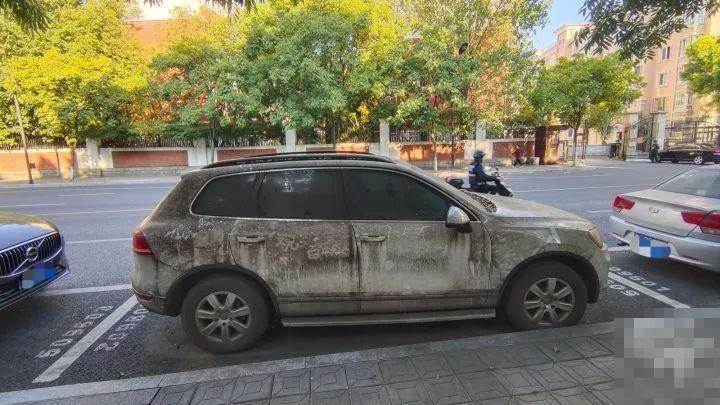 這輛停在杭州文二西路競舟路交叉口南側路面泊位上的SUV,實在太「顯眼」:白色的車身已經被厚厚的污漬染成灰黃色,灰塵厚到可以用來「涂鴉」;前后雨刷、包括車頂的行李架內都堆滿了腐爛的樹葉和污垢;車窗上像是抹上了膠水,用手觸摸都帶著黏性,湊近向內看,車輛的座椅上都已經發霉長斑……毫不客氣的說,這輛車渾身上下沒有一處干凈的地方,就像是一個蓬頭垢面的流浪漢。
