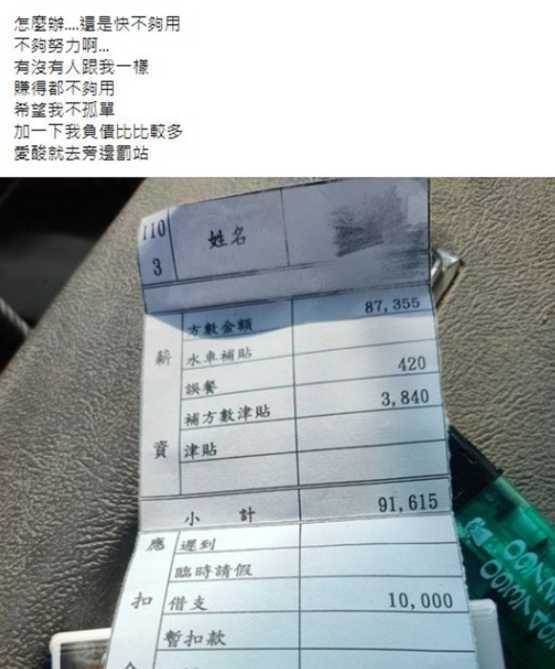 近日,一位男網友在「爆怨公社」曬出薪水條,並配文稱「怎麼辦,還是快不夠用……有沒有人和我一樣,希望我不孤單……」