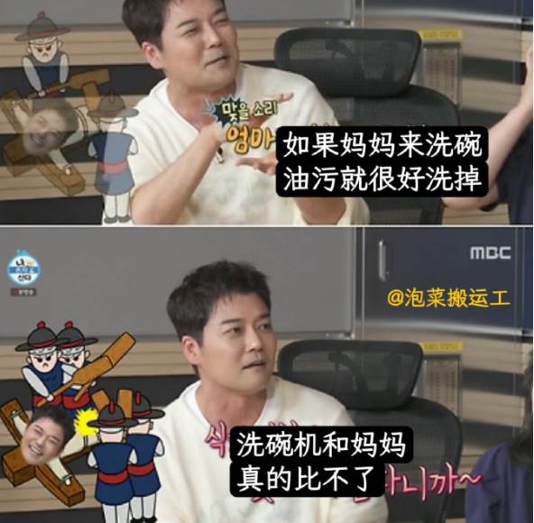 隨后,全炫茂在演播室中也附和道:「我也是,每次知道媽媽要來的時候 會看準時機把所有的碗碟都集中在那時候,媽媽很會去除污垢。」
